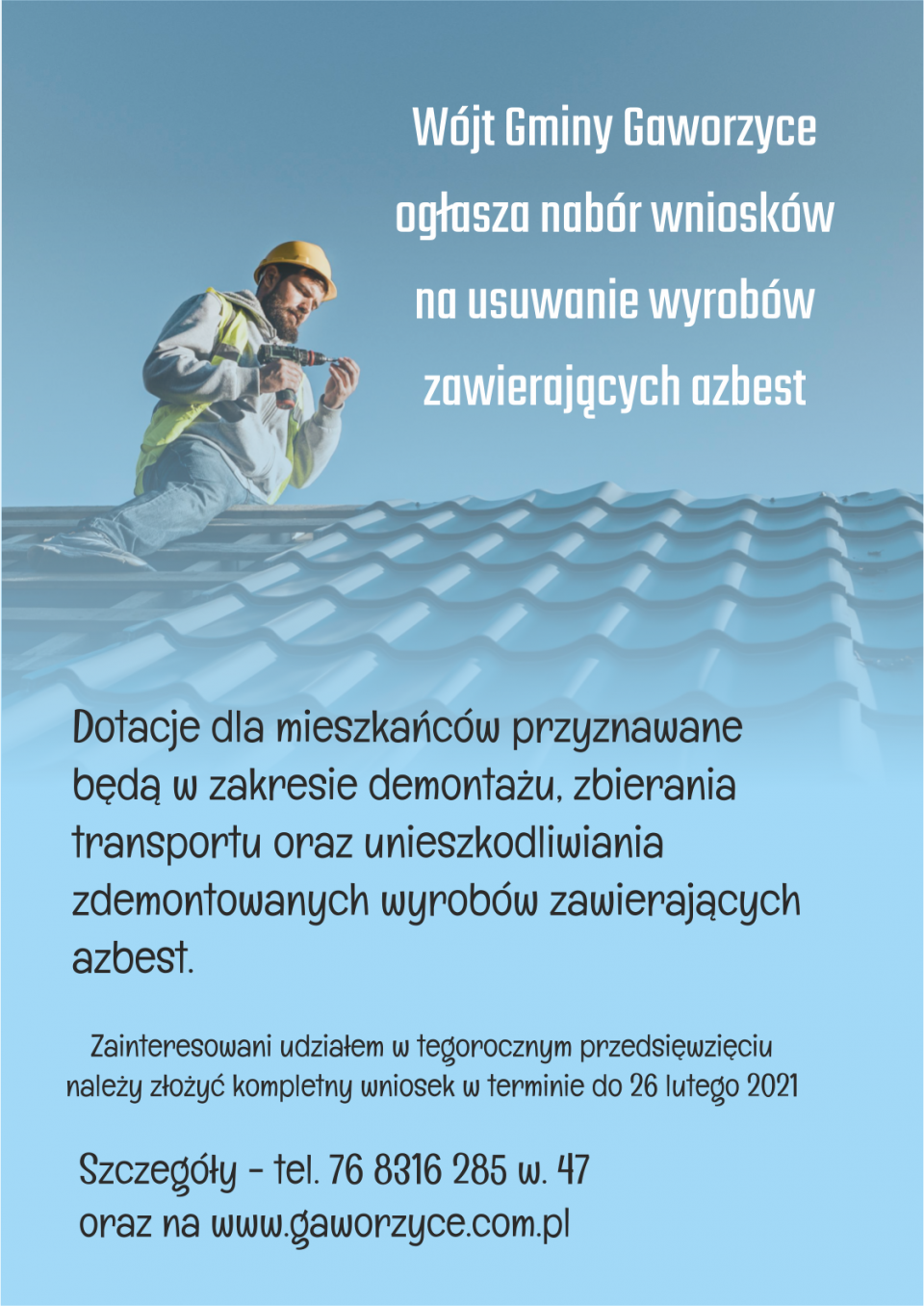 Pozbądź się azbestu! Trwa nabór wniosków! 02 lut 2021 - 26 lut 2021 Urząd Gminy w Gaworzycach wydrukuj Wójt Gminy Gaworzyce ogłasza nabór wniosków na usuwanie wyrobów zawierających azbest! Gmina Gaworzyce już po raz drugi ma zamiar przystąpić do konkursu Wojewódzkiego Funduszu Ochrony Środowiska i Gospodarki Wodnej we Wrocławiu i zdobyć dofinansowanie, które pozwoli na usunięcie wyrobów azbestowych z posesji mieszkańców w roku 2021. Dotacje dla mieszkańców gminy przyznawane będą w zakresie demontażu, zbierania, transportu oraz unieszkodliwienia zdemontowanych wyrobów zawierających azbest. Powyższe prace realizowane będą przez wykonawcę wyłonionego w trybie zapytania ofertowego lub przetargu przez Gminę Gaworzyce. Dofinansowanie nie będzie obejmować zakupu i montażu nowego pokrycia dachowego lub innych elementów obiektów budowlanych związanych z inwestycją. Zadanie będzie realizowane w momencie uzyskania dotacji ze środków WFOŚiGW. Złóż wniosek do 26 lutego! Aby wziąć udział w tegorocznym przedsięwzięciu, należy złożyć kompletny wniosek wraz z załącznikami w Urzędzie Gminy w Gaworzycach, ul. Dworcowa 95, w terminie do 26.02.2021 r. Formularze są dostępne na stronie internetowej oraz w tut. Urzędzie. Mile widziane będą dołączone zdjęcia zgłaszanych wyrobów. Zainteresowanych mieszkańców prosimy również o zapoznanie się z Uchwałą Nr XXII/146/2020 z dnia 25 czerwca 2020 w sprawie przyjęcia „Regulaminu przyznawania dotacji celowej na dofinansowanie kosztów usuwania i unieszkodliwiania wyrobów zawierających azbest z terenu Gminy Gaworzyce” . Ponadto zachęcamy wszystkich mieszkańców gminy posiadających wyroby azbestowe do zapoznania się z "Programem usuwania azbestu dla Gminy Gaworzyce na lata 2019-2032". WAŻNE ZAŁĄCZNIKI DO POBRANIA: Wniosek Oświadczenie o przeznaczeniu obiektu Ocena stanu i możliwości bezpiecznego użytkowania wyrobów zawierających azbest Informacja o wyrobach zawierających azbest