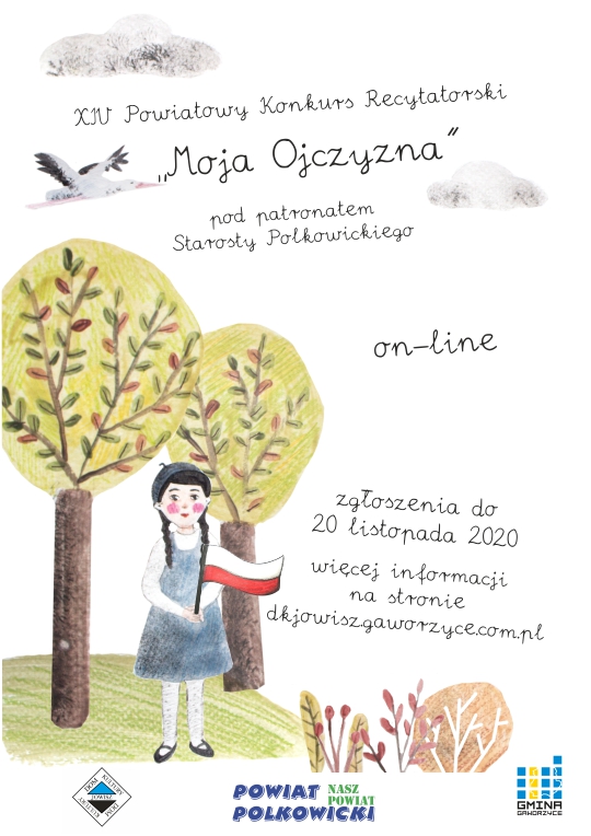 Konkursy patriotyczne w formule online 03 lis 2020 - 20 lis 2020 wydrukuj Przypominamy, że na stronie Domu Kultury "Jowisz" w Gaworzycach - www.dkjowisz.gaworzyce.com.pl są dostępne 2 konkursy o charakterze patriotycznym. Wszyscy uczniowie szkół podstawowych z powiatu polkowickiego, którzy chcą wziąć udział w konkursie, proszeni są o nadsyłanie nagrań wideo z prezentowanymi recytacjami (wiersz, fragment prozy) na adres mailowy naszego domu kultury. Szczegółowe zasady konkursu znajdują się w poniższym regulaminie. Zapraszamy serdecznie do udziału w konkursie! Na nadesłanie wykonań piosenek patriotycznych czas jest do jutra, znacznie więcej czasu zostało aby zgłosić się do konkursu recytatorskiego, nad którym objął patronat Starosta Polkowicki - Kamil Ciupak. Serdecznie zachęcamy!